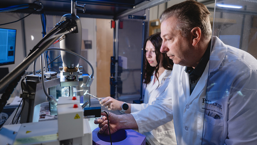 Purdue University professor Andrew Mesecar (right) and graduate student Sydney Beechboard conduct research to develop treatments for hepatocellular carcinoma. Mesecar is leading a project that has received $50,000 from Purdue Innovates Incubator to further advance the research. Mesecar is a Distinguished Professor of Biochemistry, the Walther Professor in Cancer Structural Biology and the Robert Wallace Miller Director of the Purdue Institute for Cancer Research. He leads a project to develop patented enzyme inhibitors into treatments for hepatocellular carcinoma (HCC), the most common type of liver cancer.