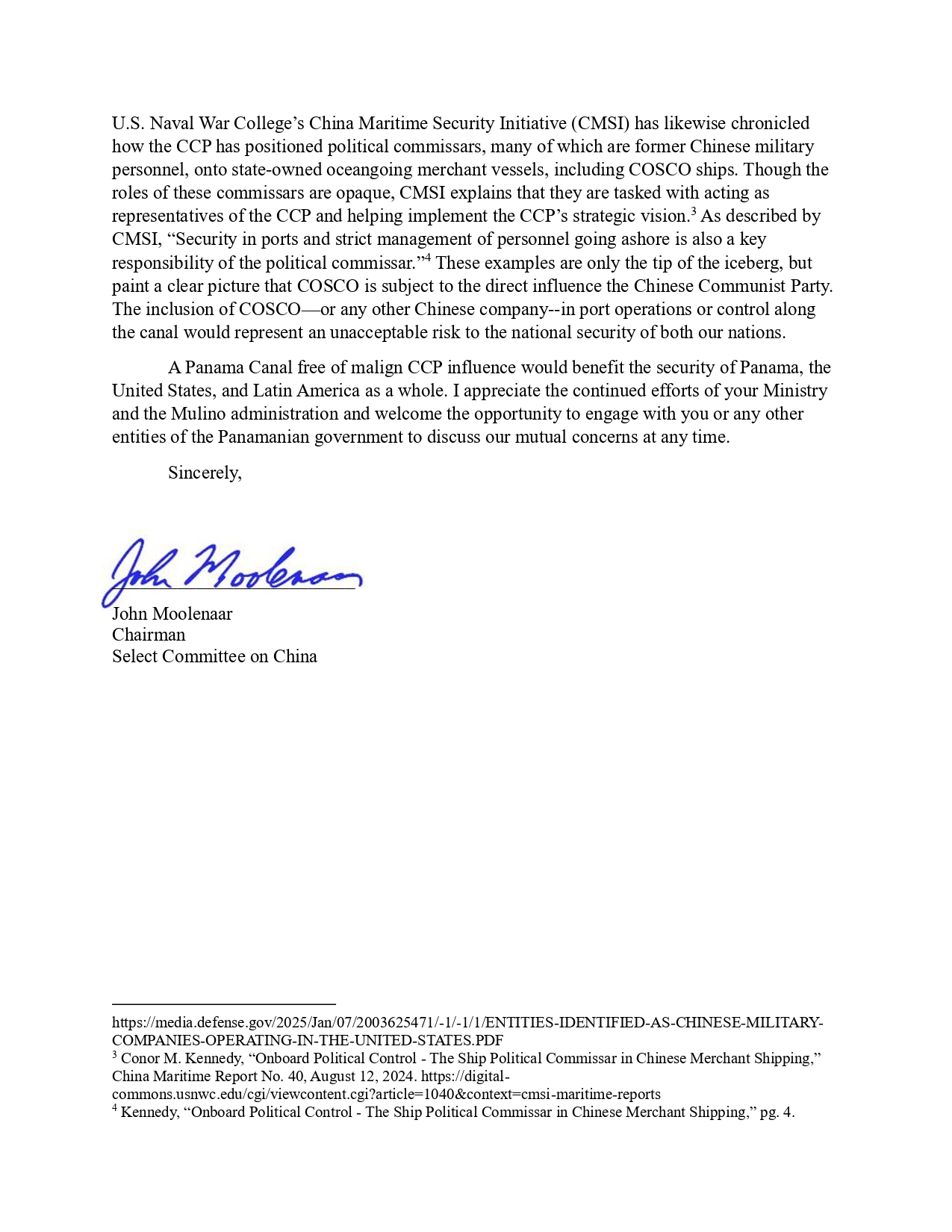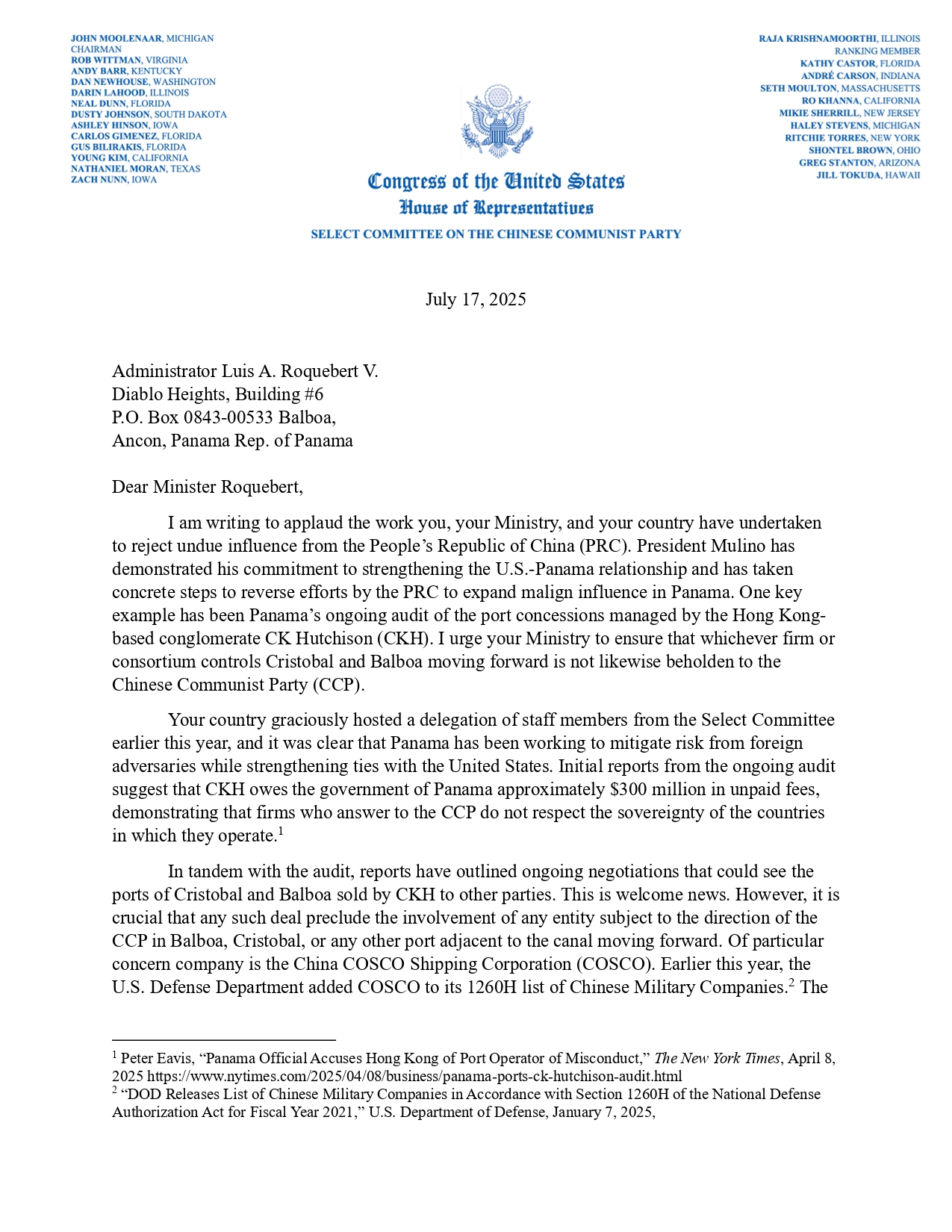 Panama City: The U.S. House Select Committee on China sent a letter this week, pictured below, to the administrator of the Panama Maritime Authority, Luis Roquebert, reiterating its concern about the growing influence of the People’s Republic of China in and around the Panama Canal. The letter, signed by Congressman John Moolenaar, chairman of the committee, acknowledges the Panamanian government’s efforts to counter what it describes as “malicious activity” by China, but also warns of potential threats linked to port concessions under review.