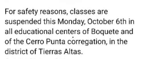 This Sunday Oct 5th, heavy rainfall caused damage and flooding in Boquete, Palmira and Volcan in the province of Chiriqui. Damages included trees falling, landslides, and partial collapse of roads in several areas. The Caldera River was cresting but did not overflow. Authorities called for calm and asked the population to avoid flooded and damaged areas. As a precaution for safety reasons, school classes have been suspended for Oct 6th in Boquete, and the Cerro Punta area of Volcan (Tierras Altas).