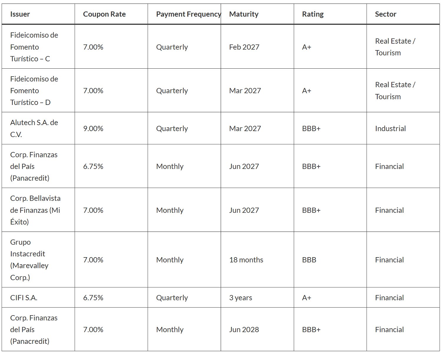 Several Panamanian corporations are now offering fixed-rate bonds with short maturities of 18 months to 3 years, providing coupons between 6.75% and 9.00% per year.