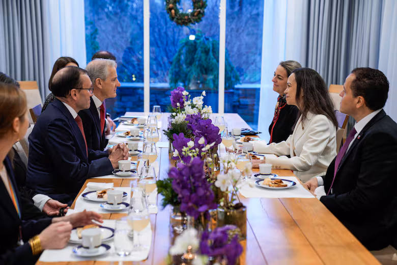 Norwegian Prime Minister Jonas Gahr Store (3rd from left), accompanied by Norwegian Foreign Minister Espen Barth Eide (2nd from left), meets with Nobel Peace Prize laureate María Corina Machado (2nd from right) at the Norwegian government’s representative office in Oslo, Norway