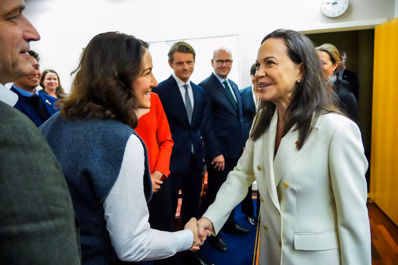 Nobel Peace Prize laureate María Corina Machado (right) greets Tonje Brenna (second from left), parliamentary leader of the Labor Party and member of the Storting’s Foreign Affairs Committee, during her visit to the Norwegian Parliament.