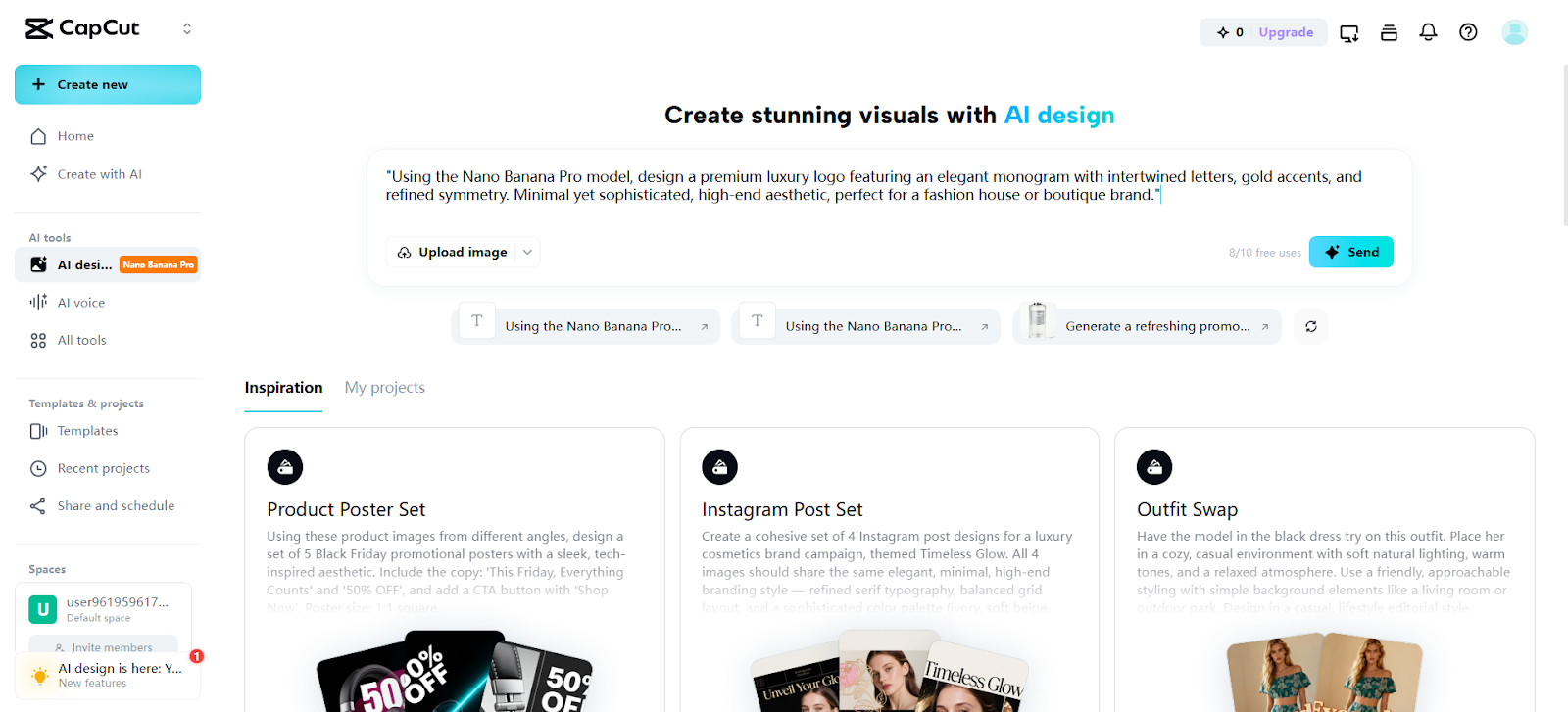Step 1: Prepare a Precision-Based Design Setup Open the CapCut video and image editor and navigate to the “AI design” option from the left vertical menu. Enter a precise prompt that captures the subject, visual style, and color tone required for sharp graphics. Select a suitable model from the options present below the prompt section. For higher visual accuracy, you can also upload the reference image to guide the design of your end logo result.