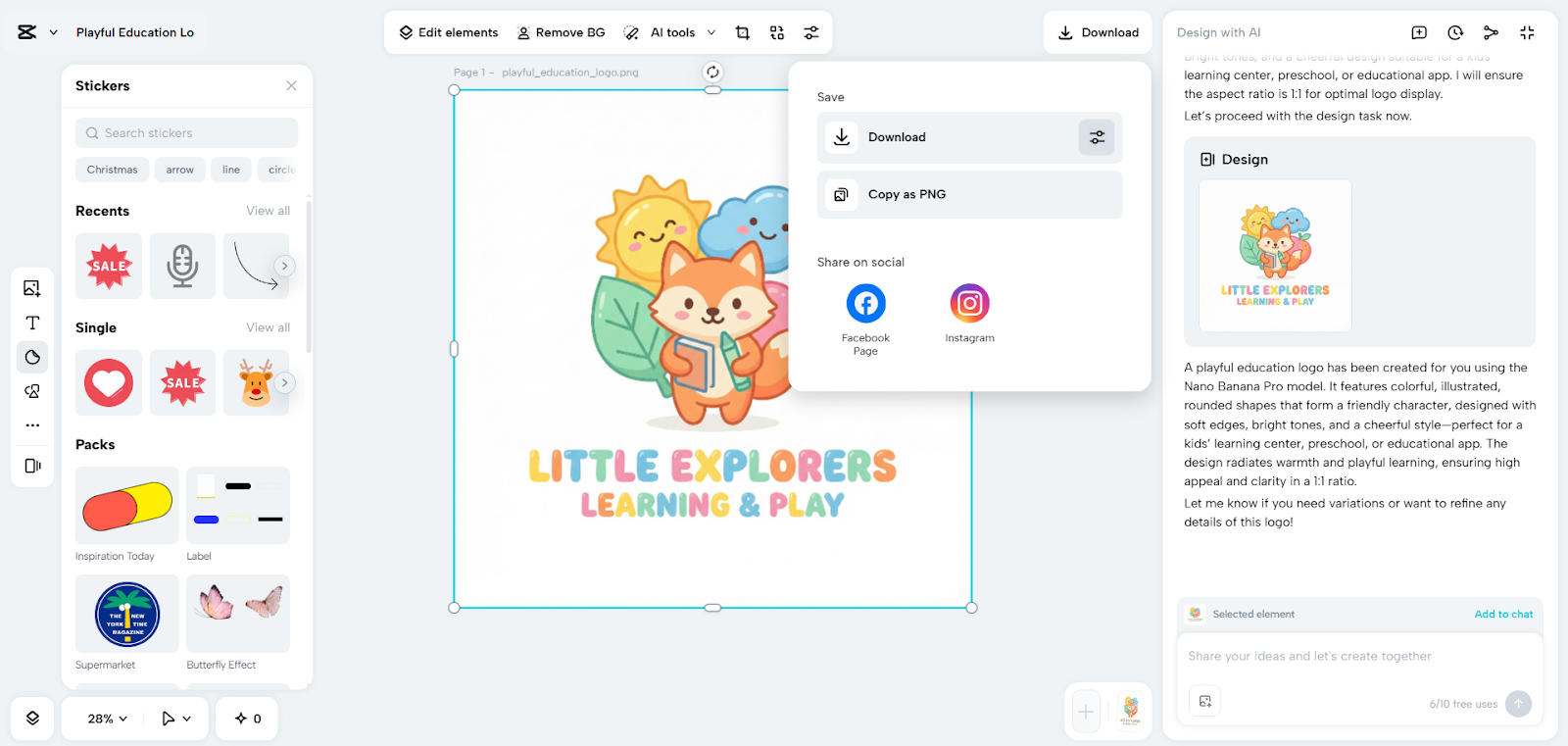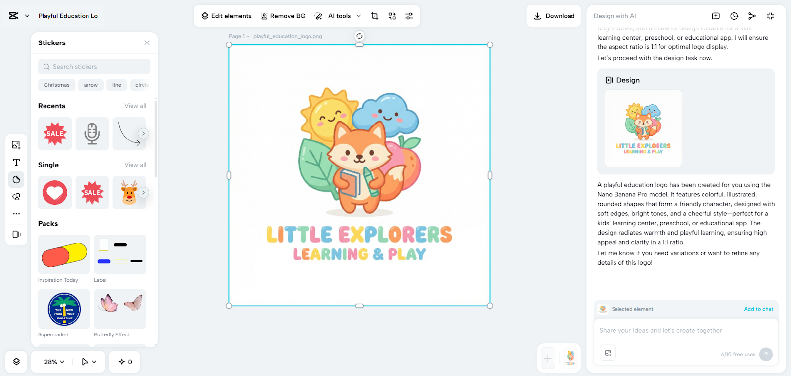 Step 2: Enhance Clarity and Visual Impact Click the “Send” tab once all inputs are ready. CapCut’s AI will analyze the text and produce the required logo design in seconds. Use built-in tools for color correction, AI upscaling, background replacement, and more to improve definition and sharpness. You can also add elements, text, shapes, stickers to customize the logo look and feel. CapCut gives you full freedom to achieve clean and professional graphics.