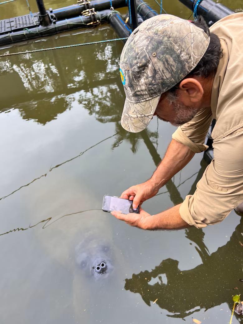 Photograph provided by Smithsonian scientist Héctor Guzmán showing him photographing a manatee for study