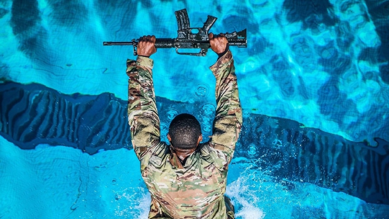 A Soldier completes a swim test, while practicing for an upcoming Jungle Operations Training Course.