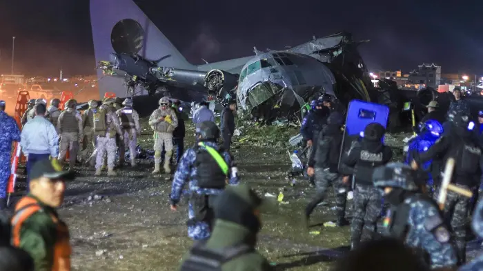 Members of the Bolivian Armed Forces guard a military cargo plane that crashed this Friday in El Alto, Bolivia. Several people tried to approach the location to collect the banknotes.