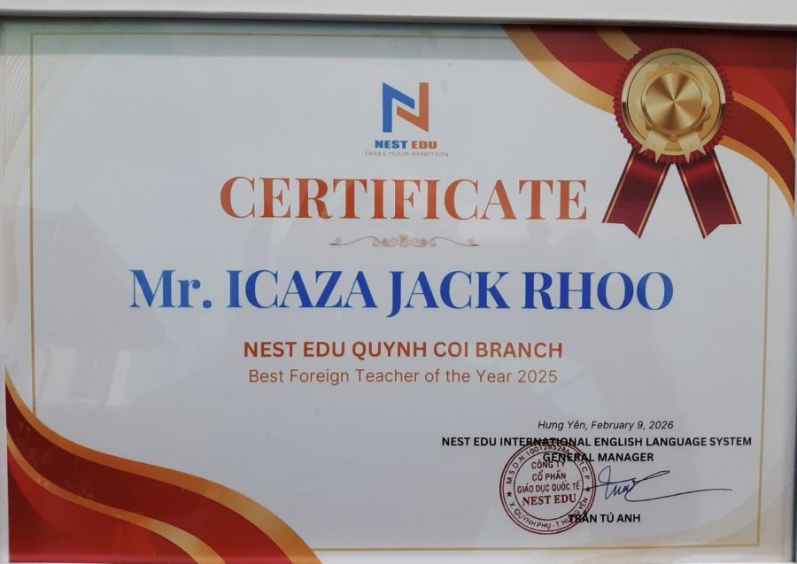 The Certificate for Best Foreign Teacher of 2025 obtained from Nest Edu Academy in Thai Binh, Vietnam, where he currently works, is well deserved. Mr Jack has had a long and rewarding career in the teaching of English as a foreign or second language, teaching students of all ages and nationalities.